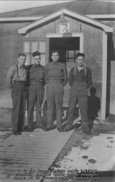 | Description: | Photograph of four men posed outdoors, on a wooden sidewalk in front of a building with the number 7 on it. The men are all standing with their hands behind their backs. Pte. Joseph Fiddler (L-8174) and Pte. Lawrence Fiddler (L-54956), standing in the centre, appear to be wearing World War II military uniforms, and the other men are wearing pants, shirts and suspenders. |