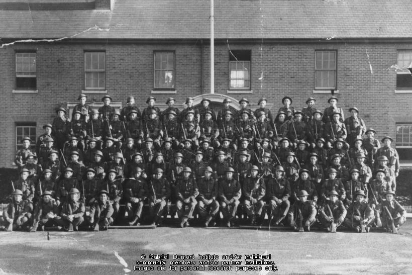 | Description: | Photograph of a large group of soldiers posed outdoors in front of a brick building. The soldiers are in uniform and they are wearing helmets and holding rifles. |