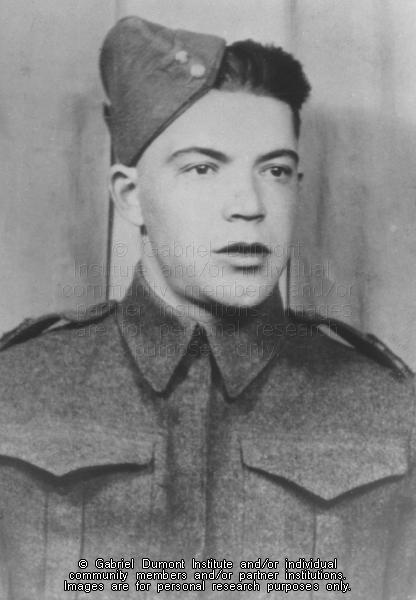 Photograph of Pte. Euclide Boyer (L-74738) from St. Laurent, Saskatchewan. Euclide enlisted in March 1942 and was discharged in 1945. He served with the Black Watch (Royal Highland Regiment) of Canada. He was wounded on August 5, 1944. He was awarded five medals. For more information Euclideʼs story is in "Remembrances: Interviews With Metis Veterans". To purchase Métis Veterans: Remembrances please visit: GDIʼs E-commerce Site. |