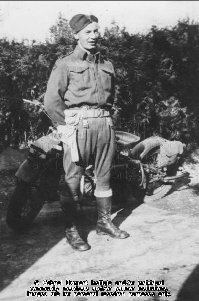 | Description: | Photograph of John Buskey (L-8697)posed in front of a motorcycle in Italy, while serving with the Royal Canadian Army Corps. |