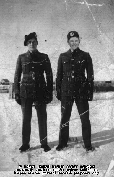 Photograph of R. Delaronde (L-106008) and Stanley Landry (L-106133)posed outdoors in the snow, in military uniform. Stanley was born on January 23, 1923 and enlisted in June, 1943 in Regina. He took his basic training at Maple Creek, Saskatchewan and his advanced training at Camp Shilo, Manitoba. He served with Princess Patricia's Canadian Light Infantry and was killed in action December 12, 1944. A cutout of a face has been pasted onto the face of the man on the right hand side of the photograph. |
