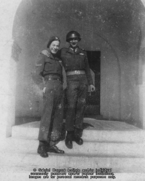 | Description: | Photograph of two unknown men in World War II military uniform. They are standing on some steps under an archway. |