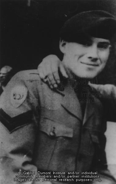 | Description: | Photograph of Cpl. Eli Caplette (SL-4508) of the Regina Rifle Regiment. Someone has their arm around his neck, but they are not visible in the picture. |