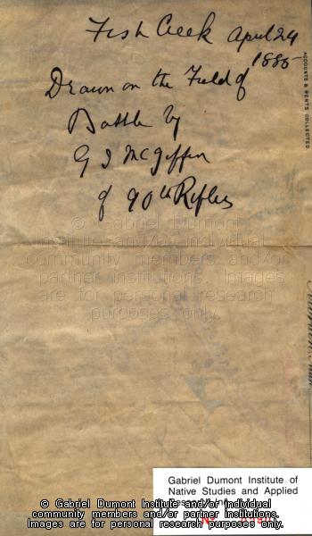 This is the reverse side of a map of the Battle of Fish Creek, dated April 24, 1885. It was drawn “on the field of battle” by G.I. McGiffen of the 90th Rifles. The writing on the back is that of Lieutenant Colonel A.C.D. Pigott. This document, part of A.C.D. Pigott’s post 1885 personal correspondence, is part of the A.C.D. Pigott Collection, which was acquired by the Gabriel Dumont Institute in October 1991 by the Ted Pappas family of Vancouver, British Columbia. The collection includes: Louis Riel’s English-French dictionary, Lieutenant Colonel Pigott’s 1885 Resistance battlefield manuscript, and a number of artifacts taken off the battlefield including: an inscribed watch, a pipe, a bullet maker and a buffalo powder horn (both from the Métis trenches), a carved wooden container taken from Big Bear’s camp, a First Nations decorative bracelet and horsehair braiding, which may have been traded for food by somebody captured by the Boulton’s Scouts. |