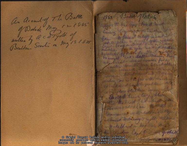This document, written during the 1885 Resistance, is part of a battlefield manuscript written by Lieutenant Colonel A.C.D. Pigott of Boulton’s Scouts. Pigott’s manuscript documents Poundmaker’s, Louis Riel’s and General Middleton’s correspondence during the 1885 Resistance. This item is part of the A.C.D. Pigott Collection, which was acquired by the Gabriel Dumont Institute in October 1991 by the Ted Pappas family of Vancouver, British Columbia. The collection includes: Louis Riel’s English-French dictionary, Lieutenant Colonel Pigott’s 1885 Resistance battlefield manuscript, and a number of artifacts taken off the battlefield including: an inscribed watch, a pipe, a bullet maker and a buffalo powder horn (both from the Métis trenches), a carved wooden container taken from Big Bear’s camp, a First Nations decorative bracelet and horsehair braiding, which may have been traded for food by somebody captured by the Boulton’s Scouts. |