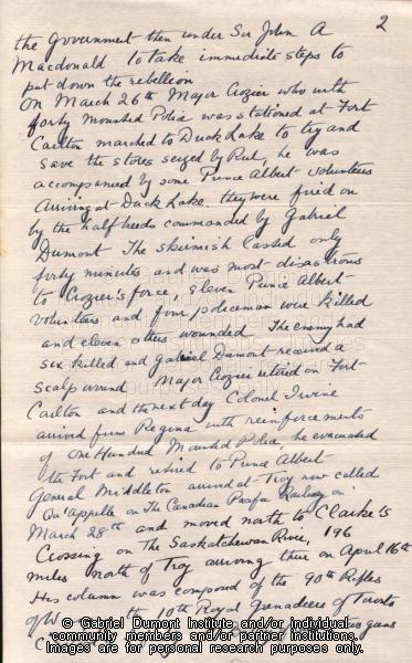 Description: In this appendix to "Resumé of the Riel Rebellion”, Lieutenant Colonel A.C.D. Pigott has written, on these four pages, (Pigott Appendix, Post 1885, April 24, 1885 1-4), his remembrances of the 1885 Resistance upon 50 years of reflection. These four pages chronicle the Battle of Fish Creek (April 24, 1885) and the start of the 1885 Resistance during the Battle of Duck Lake (March 26, 1885). Piggott also discussed the dissolution of the Métis’ land base through the Scrip System as the main cause of the Resistance. He argued that Riel’s seizure of the supply stores in the Batoche region participated the conflict as the NWMP moved in to Duck Lake to have the shop owners’ property restored. As a result, the Métis routed the Mounted Police under Major Crozier. Pigott stressed the Métis’ expertise at guerilla warfare made them a difficult target for the Mounted Police and Prince Albert Volunteers: “The halfbreeds who were commanded by Gabriel Dumont were so well entrenched that their positions were only located by the puffs of smoke”. Pigott also listed the Mounted Police and the Army’s troop movements following the Métis’ victory at Duck Lake and prior to the Battle of Fish Creek. This document, part of A.C.D. Pigott’s post 1885 personal correspondence, is part of the A.C.D. Pigott Collection, which was acquired by the Gabriel Dumont Institute in October 1991 by the Ted Pappas family of Vancouver, British Columbia. The collection includes: Louis Riel’s English-French dictionary, Lieutenant Colonel Pigott’s 1885 Resistance battlefield manuscript, and a number of artifacts taken off the battlefield including: an inscribed watch, a pipe, a bullet maker and a buffalo powder horn (both from the Métis trenches), a carved wooden container taken from Big Bear’s camp, a First Nations decorative bracelet and horsehair braiding, which may have been traded for food by somebody captured by the Boulton’s Scouts.