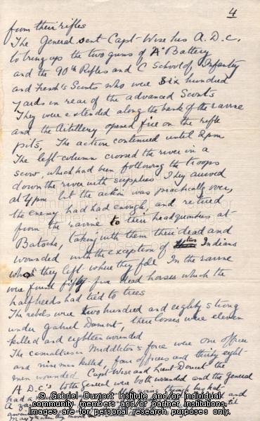 Description: In this appendix to "Resumé of the Riel Rebellion”, Lieutenant Colonel A.C.D. Pigott has written, on these four pages, (Pigott Appendix, Post 1885, April 24, 1885 1-4), his remembrances of the 1885 Resistance upon 50 years of reflection. These four pages chronicle the Battle of Fish Creek (April 24, 1885) and the start of the 1885 Resistance during the Battle of Duck Lake (March 26, 1885). Piggott also discussed the dissolution of the Métis’ land base through the Scrip System as the main cause of the Resistance. He argued that Riel’s seizure of the supply stores in the Batoche region participated the conflict as the NWMP moved in to Duck Lake to have the shop owners’ property restored. As a result, the Métis routed the Mounted Police under Major Crozier. Pigott stressed the Métis’ expertise at guerilla warfare made them a difficult target for the Mounted Police and Prince Albert Volunteers: “The halfbreeds who were commanded by Gabriel Dumont were so well entrenched that their positions were only located by the puffs of smoke”. Pigott also listed the Mounted Police and the Army’s troop movements following the Métis’ victory at Duck Lake and prior to the Battle of Fish Creek. This document, part of A.C.D. Pigott’s post 1885 personal correspondence, is part of the A.C.D. Pigott Collection, which was acquired by the Gabriel Dumont Institute in October 1991 by the Ted Pappas family of Vancouver, British Columbia. The collection includes: Louis Riel’s English-French dictionary, Lieutenant Colonel Pigott’s 1885 Resistance battlefield manuscript, and a number of artifacts taken off the battlefield including: an inscribed watch, a pipe, a bullet maker and a buffalo powder horn (both from the Métis trenches), a carved wooden container taken from Big Bear’s camp, a First Nations decorative bracelet and horsehair braiding, which may have been traded for food by somebody captured by the Boulton’s Scouts.