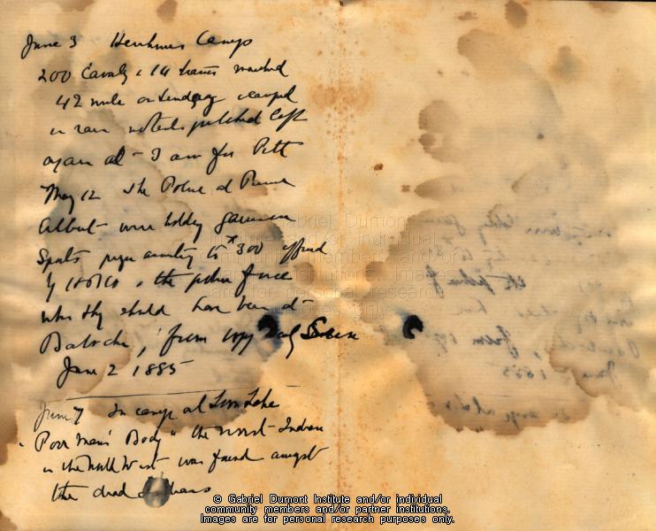 In this appendix to “Resumé of the Riel Rebellion” Lieutenant Colonel A.C.D. Pigott has written, after fighting had concluded during the 1885 Resistance, about various troop movements. This is one of only a few first-hand accounts by any member of the Canadian army during the 1885 Resistance. Pigott chronicled the 1885 Resistance from the March 26, 1885 skirmish at Duck Lake to the campaign against First Nations warriors from Big Bear’s and Poundmaker’s camps. These pages focus largely on battling the First Nations and list troop movements and the advance of columns by Generals Otter and Strange. This document also contains a number of appendices, not numbered in sequential order, including a map of the Battle of Fish Creek and a second-hand transcription of a correspondence between Big Bear, General Middleton and Louis Riel. This document, part of A.C.D. Pigott’s 1885 personal correspondence, is part of the A.C.D. Pigott Collection, which was acquired by the Gabriel Dumont Institute in October 1991 by the Ted Pappas family of Vancouver, British Columbia. The collection includes: Louis Riel’s English-French dictionary, Lieutenant Colonel Pigott’s 1885 Resistance battlefield manuscript, and a number of artifacts taken off the battlefield including: an inscribed watch, a pipe, a bullet maker and a buffalo powder horn (both from the Métis trenches), a carved wooden container taken from Big Bear’s camp, a First Nations decorative bracelet and horsehair braiding, which may have been traded for food by somebody captured by the Boulton’s Scouts. |