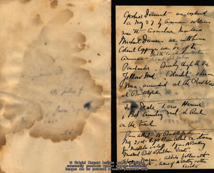 In this appendix to “Resumé of the Riel Rebellion” Lieutenant Colonel A.C.D. Pigott has written, after fighting had concluded during the 1885 Resistance, about Gabriel Dumont’s and Michael (sic) Dumais’ (sic) capture in the United States on May 27, 1885 and Canada’s failure to ask for Dumont’s return. He also mentions how Poundmaker and Louis Riel surrendered. This is one of only a few first-hand accounts by any member of the Canadian army during the 1885 Resistance. Pigott chronicled the 1885 Resistance from the March 26, 1885 skirmish at Duck Lake to the campaign against First Nations warriors from Big Bear’s and Poundmaker’s camps. These pages focus largely on battling the First Nations and list troop movements and the advance of columns by Generals Otter and Strange. This document also contains a number of appendices, not numbered in sequential order, including a map of the Battle of Fish Creek and a second-hand transcription of a correspondence between Big Bear, General Middleton and Louis Riel. This document, part of A.C.D. Pigott’s 1885 personal correspondence, is part of the A.C.D. Pigott Collection, which was acquired by the Gabriel Dumont Institute in October 1991 by the Ted Pappas family of Vancouver, British Columbia. The collection includes: Louis Riel’s English-French dictionary, Lieutenant Colonel Pigott’s 1885 Resistance battlefield manuscript, and a number of artifacts taken off the battlefield including: an inscribed watch, a pipe, a bullet maker and a buffalo powder horn (both from the Métis trenches), a carved wooden container taken from Big Bear’s camp, a First Nations decorative bracelet and horsehair braiding, which may have been traded for food by somebody captured by the Boulton’s Scouts. |