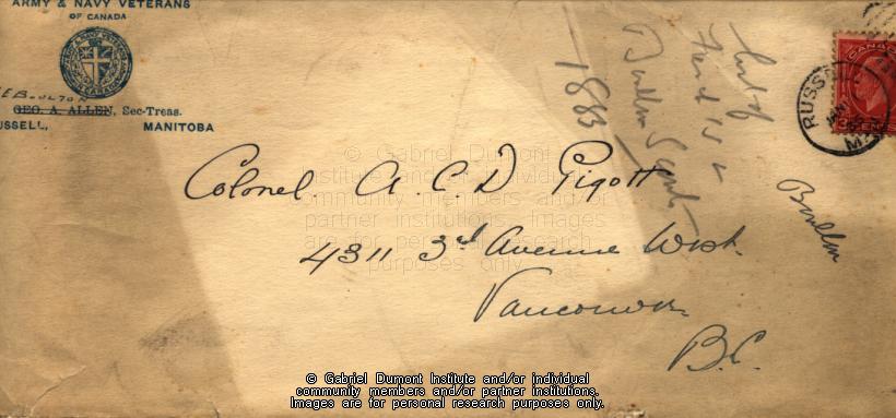 This is item is an envelope sent to Lieutenant Colonel Pigott by the Army and Navy Veterans of Canada. This item, part of A.C.D. Pigott’s post 1885 personal correspondence, is part of the A.C.D. Pigott Collection, which was acquired by the Gabriel Dumont Institute in October 1991 by the Ted Pappas family of Vancouver, British Columbia. The collection includes: Louis Riel’s English-French dictionary, Lieutenant Colonel Pigott’s 1885 Resistance battlefield manuscript, and a number of artifacts taken off the battlefield including: an inscribed watch, a pipe, a bullet maker and a buffalo powder horn (both from the Métis trenches), a carved wooden container taken from Big Bear’s camp, a First Nations decorative bracelet and horsehair braiding, which may have been traded for food by somebody captured by the Boulton’s Scouts. |