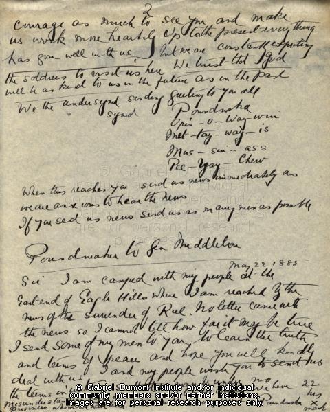 Description: In this appendix to "Resumé of the Riel Rebellion”, dated April 29, 1885, Lieutenant Colonel A.C.D. Pigott transcribed a correspondence between Poundmaker and Louis Riel (continued from Pigott Appendix, Poundmaker to Riel). He also transcribed a correspondence between Poundmaker and General Middleton dated May 22, 1885. These two correspondences may either be fictionalized accounts, transcriptions based on an interview with Poundmaker, or may be transcriptions of all actual correspondence that were obtained by the Canadian military. In this document, Poundmaker continues his letter to Louis Riel and concludes that the presence of the Métis would lift the Cree’s spirits. Poundmaker, Opin-o-way-win, Met-tay-way-is, Mas-sin-ass and Pee-Yay-Chew signed the letter. In Poundmaker’s letter to General Middleton, Poundmaker wants confirmation of the Métis defeat, and asks that the General treat his people fairly after they surrender. Poundmaker also states that the prisoners that had been taken captive earlier were well-treated and were released. Poundmaker also asks for the terms of surrender in writing “so that we may have no misunderstanding from which so much trouble arises”. Lieutenant Colonel A.C.D. Pigott wrote “Resumé of the Riel Rebellion” during various engagements of the 1885 Resistance. This is one of only a few first-hand accounts by any member of the Canadian army during the 1885 Resistance. Pigott chronicled the 1885 Resistance from the March 26, 1885 skirmish at Duck Lake to the campaign against First Nations warriors from Big Bear’s and Poundmaker’s camps. These pages focus largely on battling the First Nations and list troop movements and the advance of columns by Generals Otter and Strange. This document also contains a number of appendices, not numbered in sequential order, including a map of the Battle of Fish Creek and a second-hand transcription of a correspondence between Big Bear, General Middleton and Louis Riel. This document, part of A.C.D. Pigott’s 1885 personal correspondence, is part of the A.C.D. Pigott Collection, which was acquired by the Gabriel Dumont Institute in October 1991 by the Ted Pappas family of Vancouver, British Columbia. The collection includes: Louis Riel’s English-French dictionary, Lieutenant Colonel Pigott’s 1885 Resistance battlefield manuscript, and a number of artifacts taken off the battlefield including: an inscribed watch, a pipe, a bullet maker and a buffalo powder horn (both from the Métis trenches), a carved wooden container taken from Big Bear’s camp, a First Nations decorative bracelet and horsehair braiding, which may have been traded for food by somebody captured by the Boulton’s Scouts.