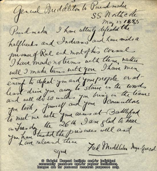 In this appendix to "Resumé of the Riel Rebellion”, Lieutenant Colonel A.C.D. Pigott transcribed a correspondence between General Middleton and Poundmaker, which is a response to Poundmaker’s letter dated May 22, 1885 (Pigott Appendix, Poundmaker to Riel, Poundmaker to Gen. Middleton). In this transcription, General Middleton indicates that there will be no terms of surrender for the Indians, as there were none for the Métis. He indicates that he has enough men to defeat Poundmaker’s band or at least “drive you away to starve in the woods”. Lieutenant Colonel A.C.D. Pigott wrote “Resumé of the Riel Rebellion” during various engagements of the 1885 Resistance. This is one of only a few first-hand accounts by any member of the Canadian army during the 1885 Resistance. Pigott chronicled the 1885 Resistance from the March 26, 1885 skirmish at Duck Lake to the campaign against First Nations warriors from Big Bear’s and Poundmaker’s camps. These pages focus largely on battling the First Nations and list troop movements and the advance of columns by Generals Otter and Strange. This document also contains a number of appendices, not numbered in sequential order, including a map of the Battle of Fish Creek and a second-hand transcription of a correspondence between Big Bear, General Middleton and Louis Riel. This document, part of A.C.D. Pigott’s 1885 personal correspondence, is part of the A.C.D. Pigott Collection, which was acquired by the Gabriel Dumont Institute in October 1991 by the Ted Pappas family of Vancouver, British Columbia. The collection includes: Louis Riel’s English-French dictionary, Lieutenant Colonel Pigott’s 1885 Resistance battlefield manuscript, and a number of artifacts taken off the battlefield including: an inscribed watch, a pipe, a bullet maker and a buffalo powder horn (both from the Métis trenches), a carved wooden container taken from Big Bear’s camp, a First Nations decorative bracelet and horsehair braiding, which may have been traded for food by somebody captured by the Boulton’s Scouts. |