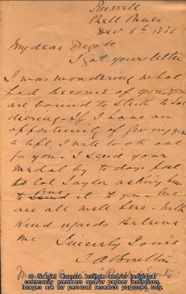 This is a letter by Major C.A. Boulton, of Boulton’s Scouts, to his comrade in arms, Lieutenant Colonel A.C.D. Pigott. The letter is dated October 6, 1885. It only reveals that the two men had fallen out of touch with one another and were in the process of renewing their friendship. This item, part of A.C.D. Pigott’s post 1885 personal correspondence, is part of the A.C.D. Pigott Collection, which was acquired by the Gabriel Dumont Institute in October 1991 by the Ted Pappas family of Vancouver, British Columbia. The collection includes: Louis Riel’s English-French dictionary, Lieutenant Colonel Pigott’s 1885 Resistance battlefield manuscript, and a number of artifacts taken off the battlefield including: an inscribed watch, a pipe, a bullet maker and a buffalo powder horn (both from the Métis trenches), a carved wooden container taken from Big Bear’s camp, a First Nations decorative bracelet and horsehair braiding, which may have been traded for food by somebody captured by the Boulton’s Scouts. |
