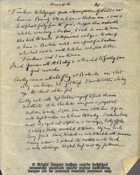 In this appendix to Resumé of the Riel Rebellion” Lieutenant Colonel A.C.D. Pigott has written, likely in the 1920s, about various anecdotes about soldiers and mounted police during the 1885 Resistance, including the role of Peter Tomkins, the government telegraph operator captured by the Métis in 1885. This is one of only a few first-hand accounts by any member of the Canadian army during the 1885 Resistance. Pigott chronicled the 1885 Resistance from the March 26, 1885 skirmish at Duck Lake to the campaign against First Nations warriors from Big Bear’s and Poundmaker’s camps. These pages focus largely on battling the First Nations and list troop movements and the advance of columns by Generals Otter and Strange. This document also contains a number of appendices, not numbered in sequential order, including a map of the Battle of Fish Creek and a second-hand transcription of a correspondence between Big Bear, General Middleton and Louis Riel. This document, part of A.C.D. Pigott’s post 1885 personal correspondence, is part of the A.C.D. Pigott Collection, which was acquired by the Gabriel Dumont Institute in October 1991 by the Ted Pappas family of Vancouver, British Columbia. The collection includes: Louis Riel’s English-French dictionary, Lieutenant Colonel Pigott’s 1885 Resistance battlefield manuscript, and a number of artifacts taken off the battlefield including: an inscribed watch, a pipe, a bullet maker and a buffalo powder horn (both from the Métis trenches), a carved wooden container taken from Big Bear’s camp, a First Nations decorative bracelet and horsehair braiding, which may have been traded for food by somebody captured by the Boulton’s Scouts. |