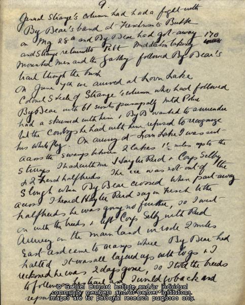 Description: Lieutenant Colonel A.C.D. Pigott wrote this document entitled “Resumé of the Riel Rebellion” during various engagements of the 1885 Resistance. This is one of only a few first-hand accounts by any member of the Canadian army during the 1885 Resistance. Pigott chronicled the 1885 Resistance from the March 26, 1885 skirmish at Duck Lake to the campaign against First Nations warriors from Big Bear’s and Poundmaker’s camps. These pages focus largely on battling the First Nations and list troop movements and the advance of columns by Generals Otter and Strange. This document also contains a number of appendices, not numbered in sequential order, including a map of the Battle of Fish Creek and a second-hand transcription of a correspondence between Big Bear, General Middleton and Louis Riel. Page 9 of this document indicates that on May 28, 1885, General Strange’s column had a firefight with warriors from Big Bear’s band. Later when Big Bear wanted to surrender, the army scouts ignored Big Bear’s white flag, resulting in his flight. Pigott also mentioned that Métis scouts or “breeds” were used to track Big Bear. This document, part of A.C.D. Pigott’s 1885 personal correspondence, is part of the A.C.D. Pigott Collection, which was acquired by the Gabriel Dumont Institute in October 1991 by the Ted Pappas family of Vancouver, British Columbia. The collection includes: Louis Riel’s English-French dictionary, Lieutenant Colonel Pigott’s 1885 Resistance battlefield manuscript, and a number of artifacts taken off the battlefield including: an inscribed watch, a pipe, a bullet maker and a buffalo powder horn (both from the Métis trenches), a carved wooden container taken from Big Bear’s camp, a First Nations decorative bracelet and horsehair braiding, which may have been traded for food by somebody captured by the Boulton’s Scouts.