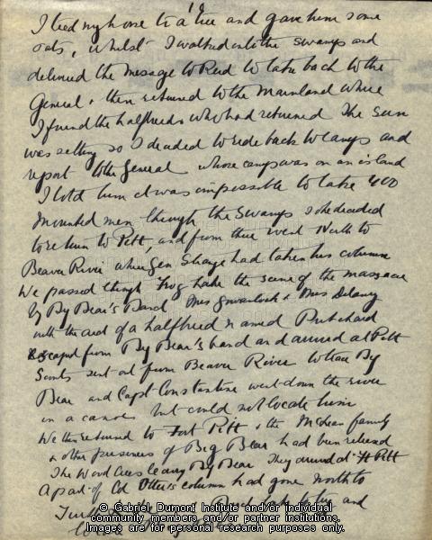 Lieutenant Colonel A.C.D. Pigott wrote this document entitled “Resumé of the Riel Rebellion” during various engagements of the 1885 Resistance. This is one of only a few first-hand accounts by any member of the Canadian army during the 1885 Resistance. Pigott chronicled the 1885 Resistance from the March 26, 1885 skirmish at Duck Lake to the campaign against First Nations warriors from Big Bear’s and Poundmaker’s camps. These pages focus largely on battling the First Nations and list troop movements and the advance of columns by Generals Otter and Strange. This document also contains a number of appendices, not numbered in sequential order, including a map of the Battle of Fish Creek and a second-hand transcription of a correspondence between Big Bear, General Middleton and Louis Riel. Page 10 of this document indicates that Pigott liaised with Métis scouts in their attempt to apprehend Big Bear, that Pigott passed through Frog Lake, “the scene of the massacre”, that he met three captives held by Big Bear’s band, Teresa Gowanlock, Teresa Delaney and John Pritchard, a Métis and that he met Wood Crees that abandoned Big Bear’s band. This document, part of A.C.D. Pigott’s 1885 personal correspondence, is part of the A.C.D. Pigott Collection, which was acquired by the Gabriel Dumont Institute in October 1991 by the Ted Pappas family of Vancouver, British Columbia. The collection includes: Louis Riel’s English-French dictionary, Lieutenant Colonel Pigott’s 1885 Resistance battlefield manuscript, and a number of artifacts taken off the battlefield including: an inscribed watch, a pipe, a bullet maker and a buffalo powder horn (both from the Métis trenches), a carved wooden container taken from Big Bear’s camp, a First Nations decorative bracelet and horsehair braiding, which may have been traded for food by somebody captured by the Boulton’s Scouts. |
