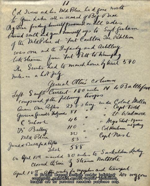 Lieutenant Colonel A.C.D. Pigott wrote this document entitled “Resumé of the Riel Rebellion” during various engagements of the 1885 Resistance. This is one of only a few first-hand accounts by any member of the Canadian army during the 1885 Resistance. Pigott chronicled the 1885 Resistance from the March 26, 1885 skirmish at Duck Lake to the campaign against First Nations warriors from Big Bear’s and Poundmaker’s camps. These pages focus largely on battling the First Nations and list troop movements and the advance of columns by Generals Otter and Strange. This document also contains a number of appendices, not numbered in sequential order, including a map of the Battle of Fish Creek and a second-hand transcription of a correspondence between Big Bear, General Middleton and Louis Riel. Page 11 of this document indicates that after the North West Mounted Police under Colonel Irvine were called in the search for Big Bear, the chief and his band surrendered after being surrounded on all sides. With that, Pigott wrote, “the rebellion was over”. He also mentioned the names of the commanders of each troop in Colonel Otter’s column, which marched across the prairie from Swift Current to North Battleford. This document, part of A.C.D. Pigott’s post 1885 personal correspondence, is part of the A.C.D. Pigott Collection, which was acquired by the Gabriel Dumont Institute in October 1991 by the Ted Pappas family of Vancouver, British Columbia. The collection includes: Louis Riel’s English-French dictionary, Lieutenant Colonel Pigott’s 1885 Resistance battlefield manuscript, and a number of artifacts taken off the battlefield including: an inscribed watch, a pipe, a bullet maker and a buffalo powder horn (both from the Métis trenches), a carved wooden container taken from Big Bear’s camp, a First Nations decorative bracelet and horsehair braiding, which may have been traded for food by somebody captured by the Boulton’s Scouts. |