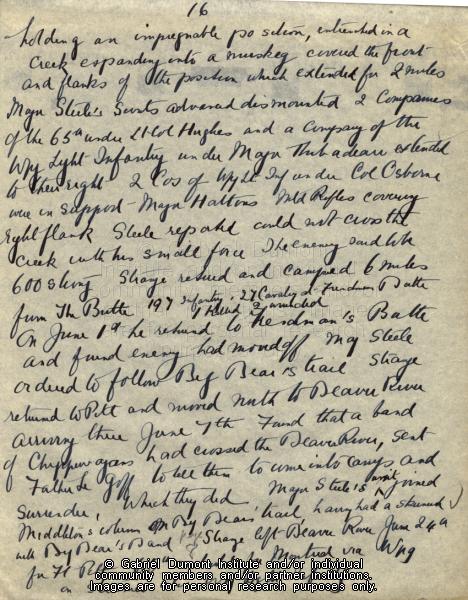 Lieutenant Colonel A.C.D. Pigott wrote this document entitled “Resumé of the Riel Rebellion” during various engagements of the 1885 Resistance. This is one of only a few first-hand accounts by any member of the Canadian army during the 1885 Resistance. Pigott chronicled the 1885 Resistance from the March 26, 1885 skirmish at Duck Lake to the campaign against First Nations warriors from Big Bear’s and Poundmaker’s camps. These pages focus largely on battling the First Nations and list troop movements and the advance of columns by Generals Otter and Strange. This document also contains a number of appendices, not numbered in sequential order, including a map of the Battle of Fish Creek and a second-hand transcription of a correspondence between Big Bear, General Middleton and Louis Riel. Page 16 of this document discusses General Strange’s efforts to capture or fight Big Bear’s band. This document, part of A.C.D. Pigott’s 1885 personal correspondence, is part of the A.C.D. Pigott Collection, which was acquired by the Gabriel Dumont Institute in October 1991 by the Ted Pappas family of Vancouver, British Columbia. The collection includes: Louis Riel’s English-French dictionary, Lieutenant Colonel Pigott’s 1885 Resistance battlefield manuscript, and a number of artifacts taken off the battlefield including: an inscribed watch, a pipe, a bullet maker and a buffalo powder horn (both from the Métis trenches), a carved wooden container taken from Big Bear’s camp, a First Nations decorative bracelet and horsehair braiding, which may have been traded for food by somebody captured by the Boulton’s Scouts. |