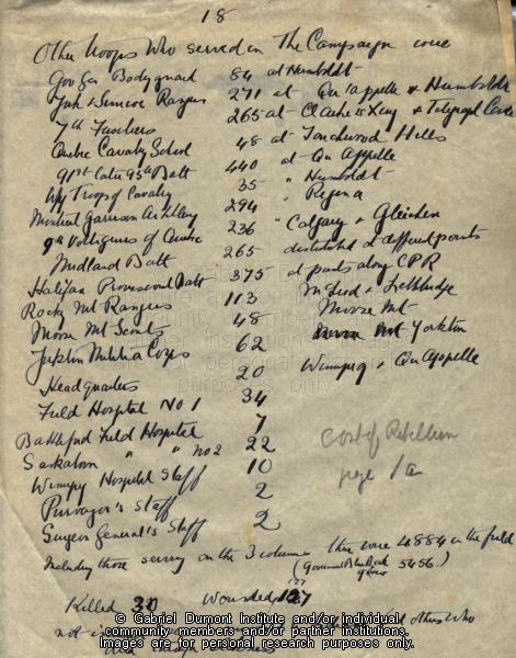 Lieutenant Colonel A.C.D. Pigott wrote this document entitled “Resumé of the Riel Rebellion” during various engagements of the 1885 Resistance. This is one of only a few first-hand accounts by any member of the Canadian army during the 1885 Resistance. Pigott chronicled the 1885 Resistance from the March 26, 1885 skirmish at Duck Lake to the campaign against First Nations warriors from Big Bear’s and Poundmaker’s camps. These pages focus largely on battling the First Nations and list troop movements and the advance of columns by Generals Otter and Strange. This document also contains a number of appendices, not numbered in sequential order, including a map of the Battle of Fish Creek and a second-hand transcription of a correspondence between Big Bear, General Middleton and Louis Riel. Page 18 of this document lists some of the battle groups which took part in the 1885 Resistance. Pigott indicated that 30 Canadian soldiers were killed and 127 were wounded. He estimated that 4,884 troops fought in the 1885 Resistance. This document, part of A.C.D. Pigott’s 1885 personal correspondence, is part of the A.C.D. Pigott Collection, which was acquired by the Gabriel Dumont Institute in October 1991 by the Ted Pappas family of Vancouver, British Columbia. The collection includes: Louis Riel’s English-French dictionary, Lieutenant Colonel Pigott’s 1885 Resistance battlefield manuscript, and a number of artifacts taken off the battlefield including: an inscribed watch, a pipe, a bullet maker and a buffalo powder horn (both from the Métis trenches), a carved wooden container taken from Big Bear’s camp, a First Nations decorative bracelet and horsehair braiding, which may have been traded for food by somebody captured by the Boulton’s Scouts. |