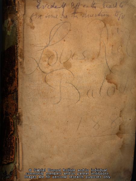 | Description: | The inside page of this English-French dictionary contains what may be Louis Riel’s signature. Inscribed on the page is “Louis Riel, Batoche 1882”. This document is part of the A.C.D. Pigott Collection, which was acquired by the Gabriel Dumont Institute in October 1991 by the Ted Pappas family of Vancouver, British Columbia. The collection includes: Louis Riel’s English-French dictionary, Lieutenant Colonel Pigott’s 1885 Resistance battlefield manuscript, and a number of artifacts taken off the battlefield including: an inscribed watch, a pipe, a bullet maker and a buffalo powder horn (both from the Métis trenches), a carved wooden container taken from Big Bear’s camp, a First Nations decorative bracelet and horsehair braiding, which may have been traded for food by somebody captured by the Boulton’s Scouts. |
