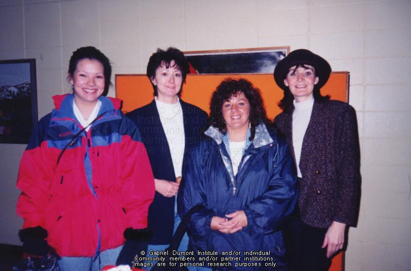 | Description: | Photograph of three Saskatchewan Urban Native Teacher Education Program (SUNTEP) students. They are, from left to right: Shelby Laframboise, unknown woman, and Angie Caron. At the extreme right is Kathy Hodgson-Smith, a former SUNTEP faculty member now with the Métis Nation -- Saskatchewan. |