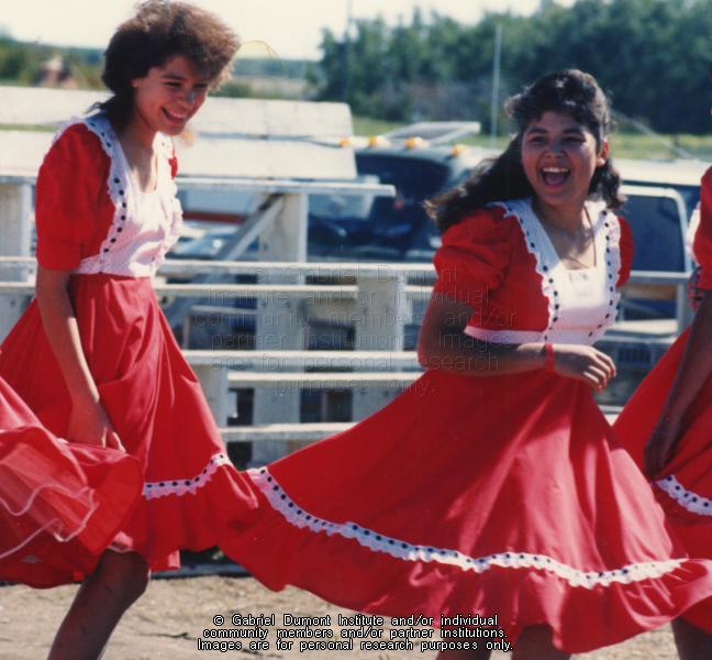 | Description: | Photograph of two young ladies square dancing at Batoche. |