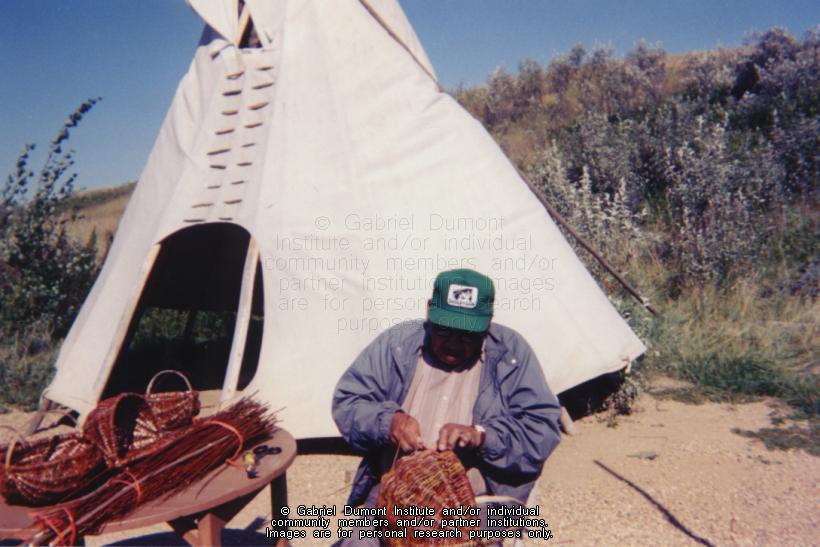 | Description: | Photograph of man making willow baskets in front of tipi. |