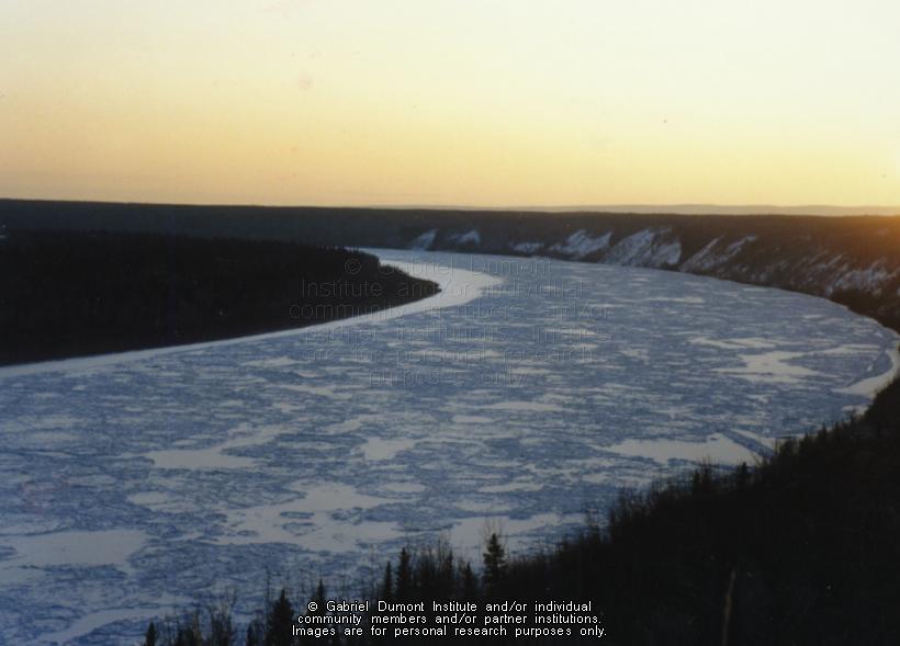 | Description: | Photograph of the ice breaking up on the Peace River in the spring. This view is from Larry Chartrand's parents place in the Paddle Prairie Metis Settlements. |