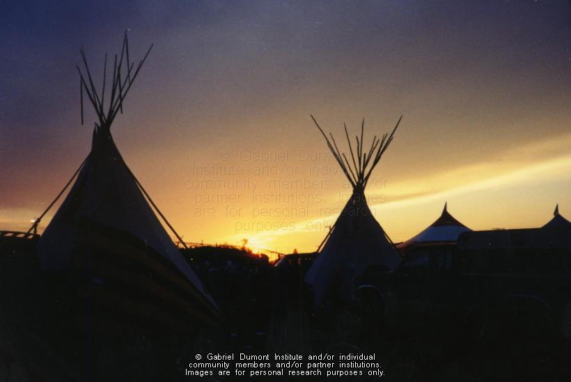 | Description: | Photograph of tipis backdropped by the sunset. |