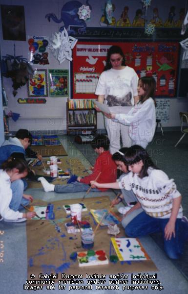 | Description: | Photograph of a Saskatchewan Urban Native Teachers Education Program (SUNTEP) student teaching an elementary class to paint. |