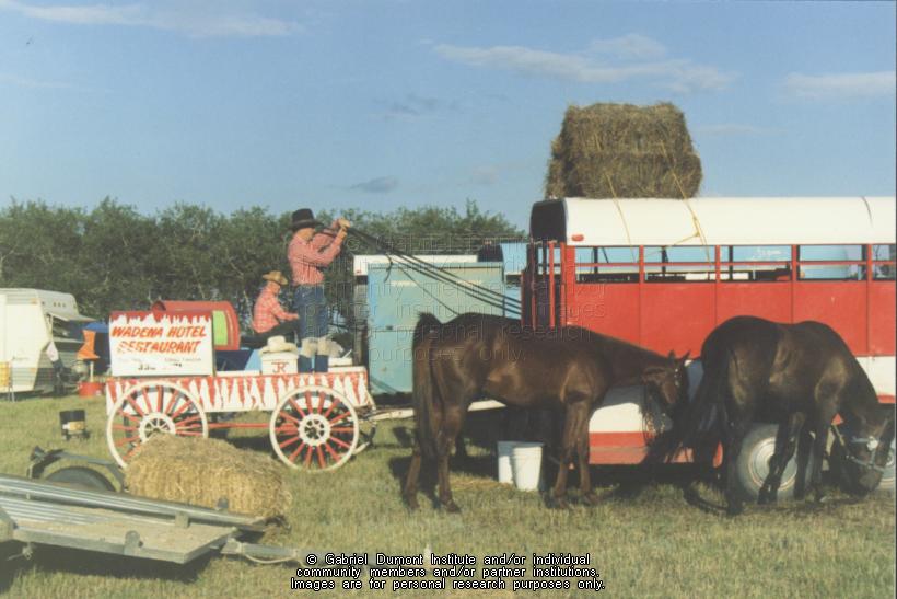 | Description: | Photograph of the Wadena Hotel Restaurant-sponsored chuck wagon driver preparing for race. |