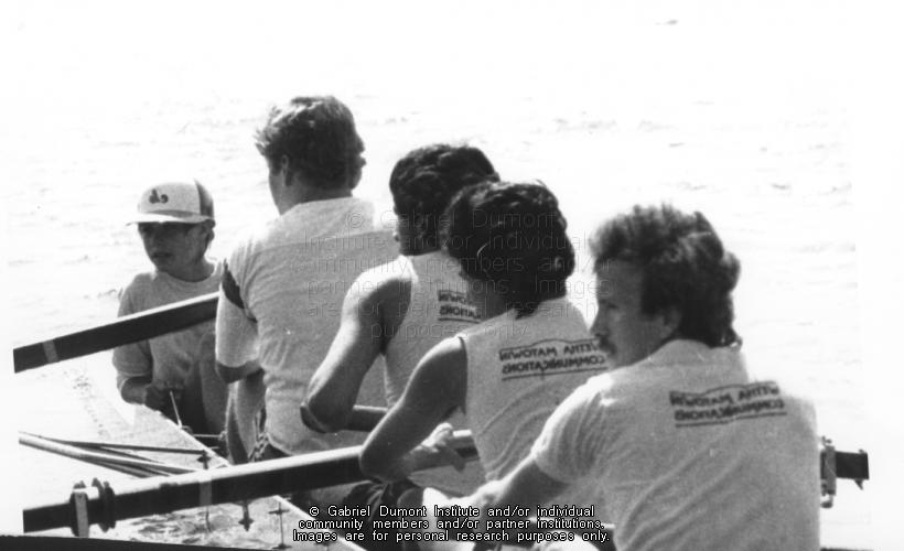 | Description: | Photograph of a rowing crew, close up. Three of the rowers are Rodger Ross, April Boyd and Larry Laliberte. This image originally appeared in or was taken for New Breed Magazine in 1981. This was at a Media contest on Canada Day in 1981. Larry Laliberte was working for New Breed and Rodger Ross and April Boyd were working for Wehta Matowin, which means communicating with each other. |