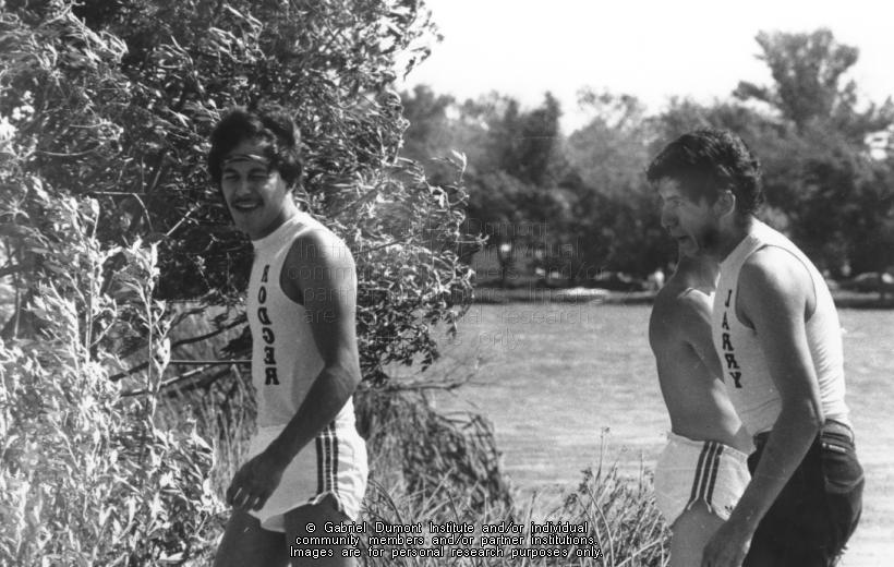 | Description: | Photograph of two of the rowing crew, Rodger Ross and Larry Laliberte, after a grueling race. This image originally appeared in or was taken for New Breed Magazine in 1981. This was at a Media contest on Canada Day in 1981. Larry Laliberte was working for New Breed and Rodger Ross and April Boyd were working for Wehta Matowin, which means communicating with each other. |