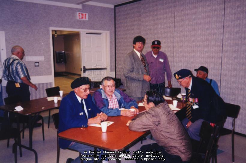 | Description: | Photograph of Métis veterans sitting around discussing the old days. |