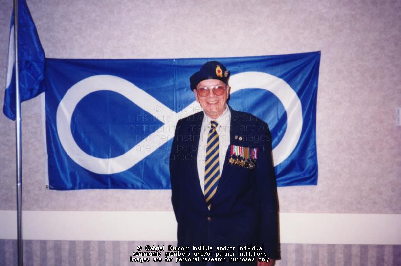 Description: Photograph of Charlie Umpherville, a Métis veteran in front of the Métis flag at the Prince Albert Metis Fall Festival in 1998.