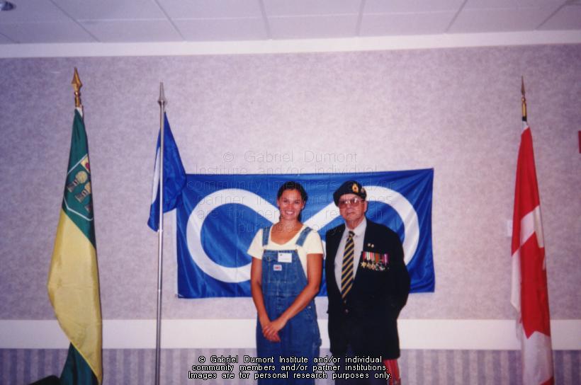Description: Photograph of Charlie Umpherville, a Métis veteran, with Leah Dorion, in front of the Métis flag at the Prince Albert Metis Fall Festival in 1998.