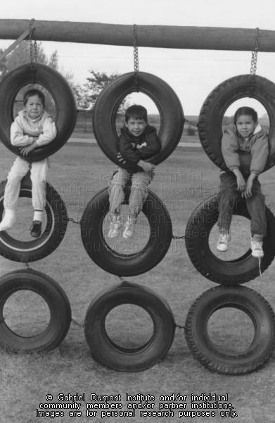 | Description: | Photograph of three children hanging on a tire ladder at their school. |