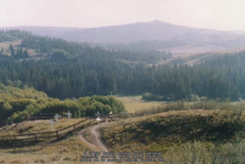 | Description: | Photograph of the Fort Walsh Civilian Cemetery located on the side of a hill near Fort Walsh. |