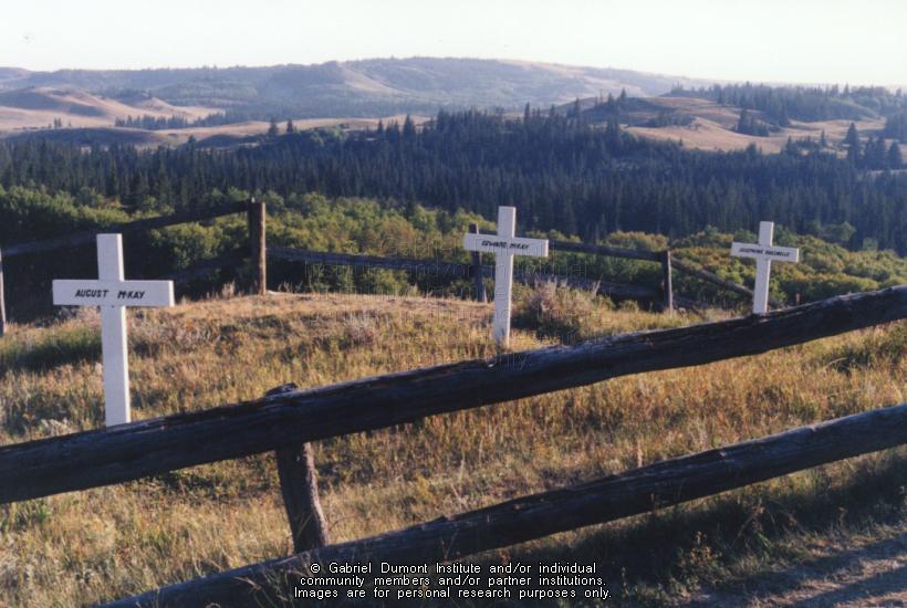 | Description: | Photograph of the gravesites of August McKay, Edward McKay, and Josephine Quesnelle in the Fort Walsh Civilian Cemetery. |
