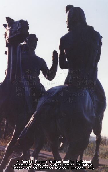 | Description: | Photograph of a statue depicting the meeting of North West Mounted Police Superintendant James Walsh and Sioux Chief Sitting Bull. |