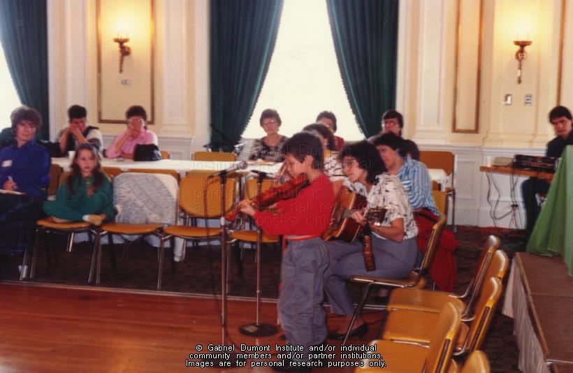 | Description: | Photograph of a young Métis boy fiddling for the crowd. |