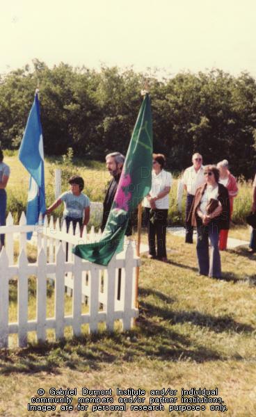 | Description: | Photograph of people attending a ceremony at the Batoche cemetery. |