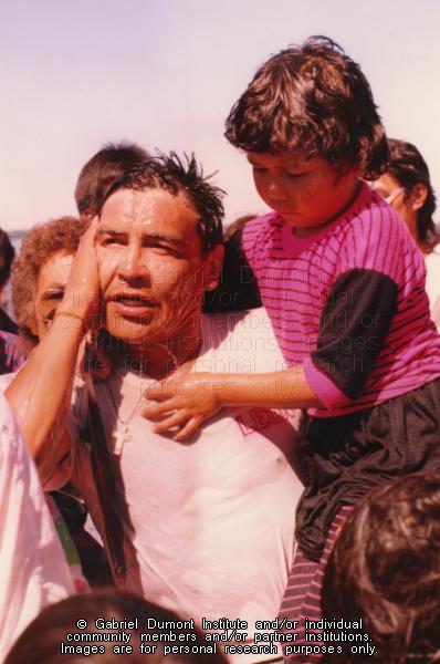 | Description: | Photograph of Leon Herman at the end of his walk from La Loche, washing himself in Lac Ste. Anne, Alberta. He is carrying his daughter Maxine. |