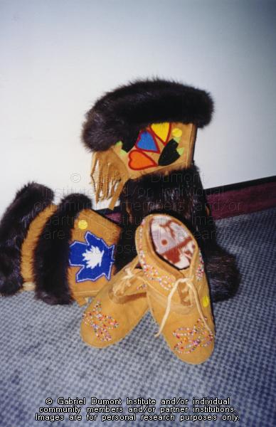 | Description: | Photograph of leather gloves and moccasins decorated with beadwork and fur. |