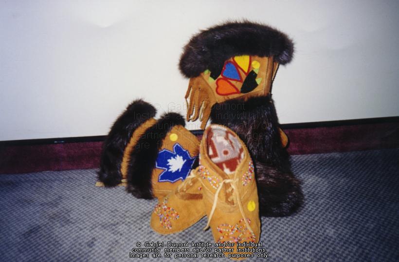 | Description: | Photograph of leather gloves and moccasins decorated with beadwork and fur. |