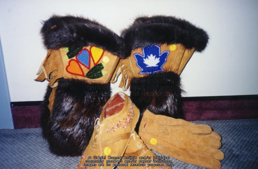 | Description: | Photograph of leather gloves and moccasins decorated with beadwork and fur. |