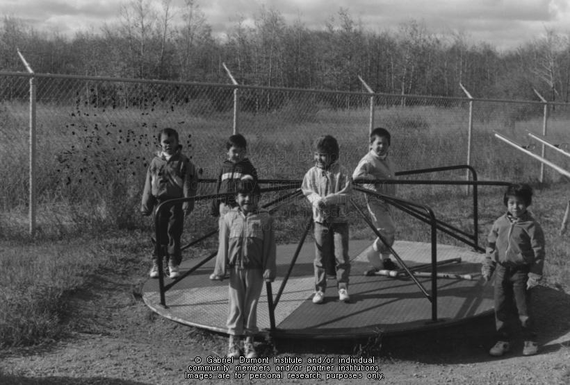 | Description: | Photograph of children posing on a merry-go-round in their school playground. |
