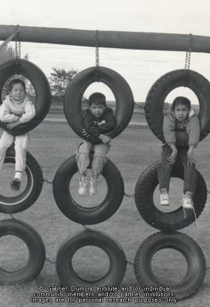 | Description: | Photograph of children posing on a tire ladder in their school playground. |