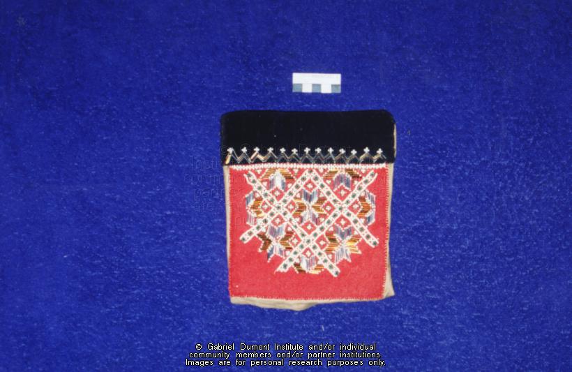 | Description: | This is a photograph of a beaded First Nations bag, which was taken from either Big Bear or Poundmaker’s camps. It was made prior to 1885. This artifact is part of the A.C. D. Pigott Collection, which was donated to the Gabriel Dumont Institute in October 1991 by the Pappas family of Vancouver, British Columbia. The collection includes: Louis Riel’s English-French dictionary, Lieutenant Colonel Pigott’s 1885 Resistance battlefield manuscript, and a number of artifacts taken off the battlefield including: an inscribed watch, a pipe, a bullet maker and a buffalo powder horn (both from the Métis trenches), a carved wooden container taken from Big Bear’s camp, a First Nations decorative bracelet and horsehair braiding, which may have been traded for food by somebody captured by the Boulton’s Scouts. |