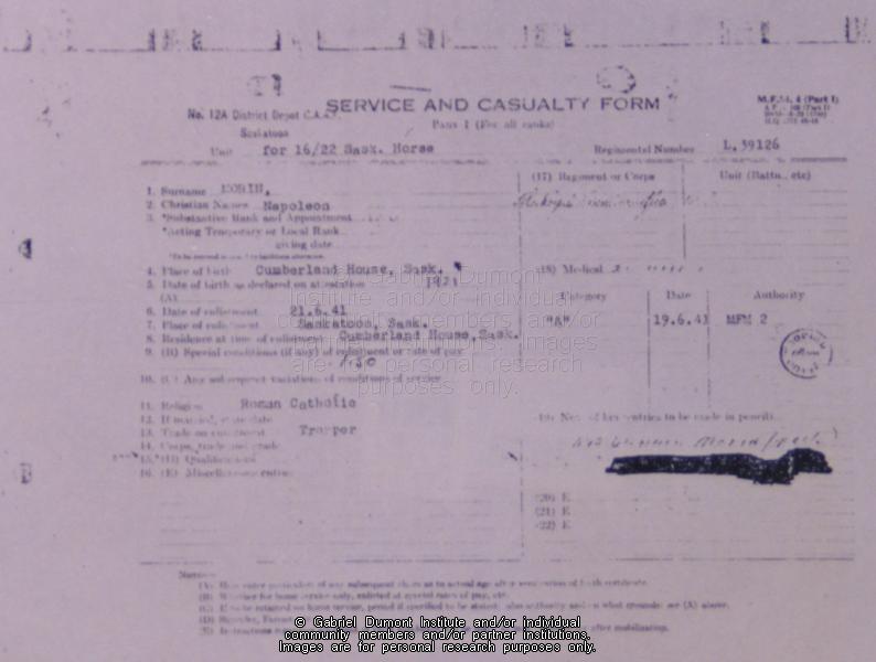 Description: Photograph of the service and casualty form for Napoleon Morin.